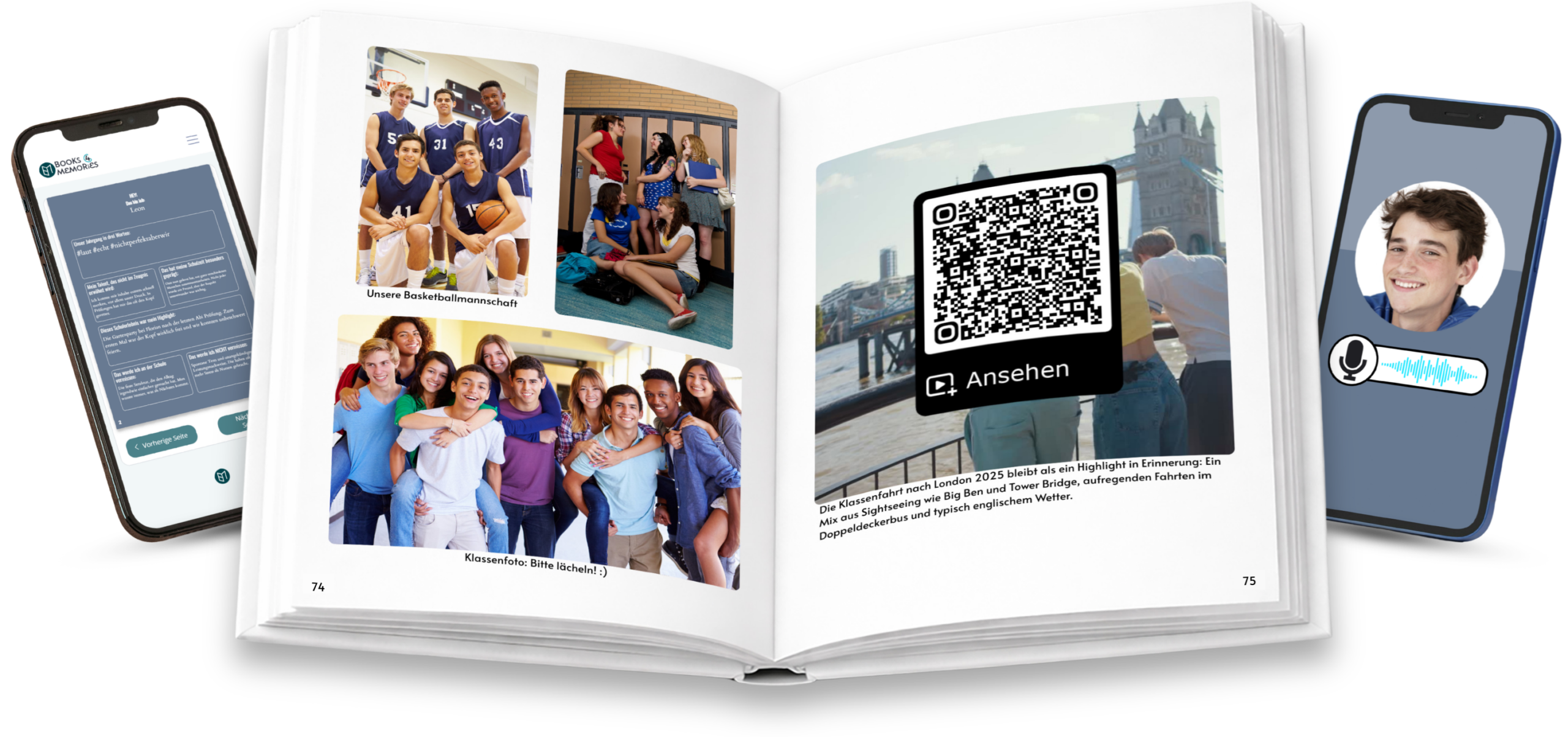 The High School Yearbook is made for graduating year groups and high school students who want to create a shared memory of their school years. Everyone contributes their own profile page, photos, videos and a voice message.